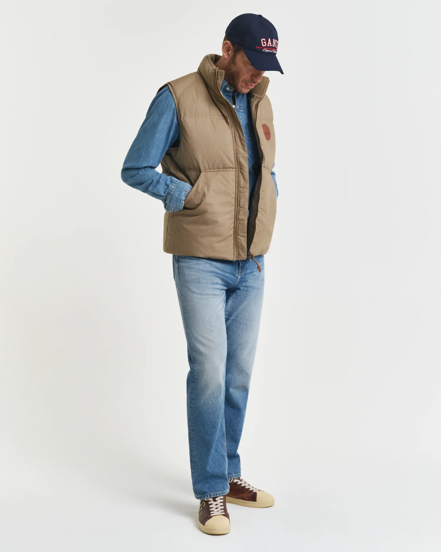 Crafted with a vintage-inspired puffer design, this cotton vest is an essential layering piece for the season. Designed with a regular fit, it features a stand collar, front zip closure, kangaroo pockets, an adjustable drawstring hem and leather GANT badge at the chest. Fully lined, the vest is complete with a mid-down interior and two pockets.