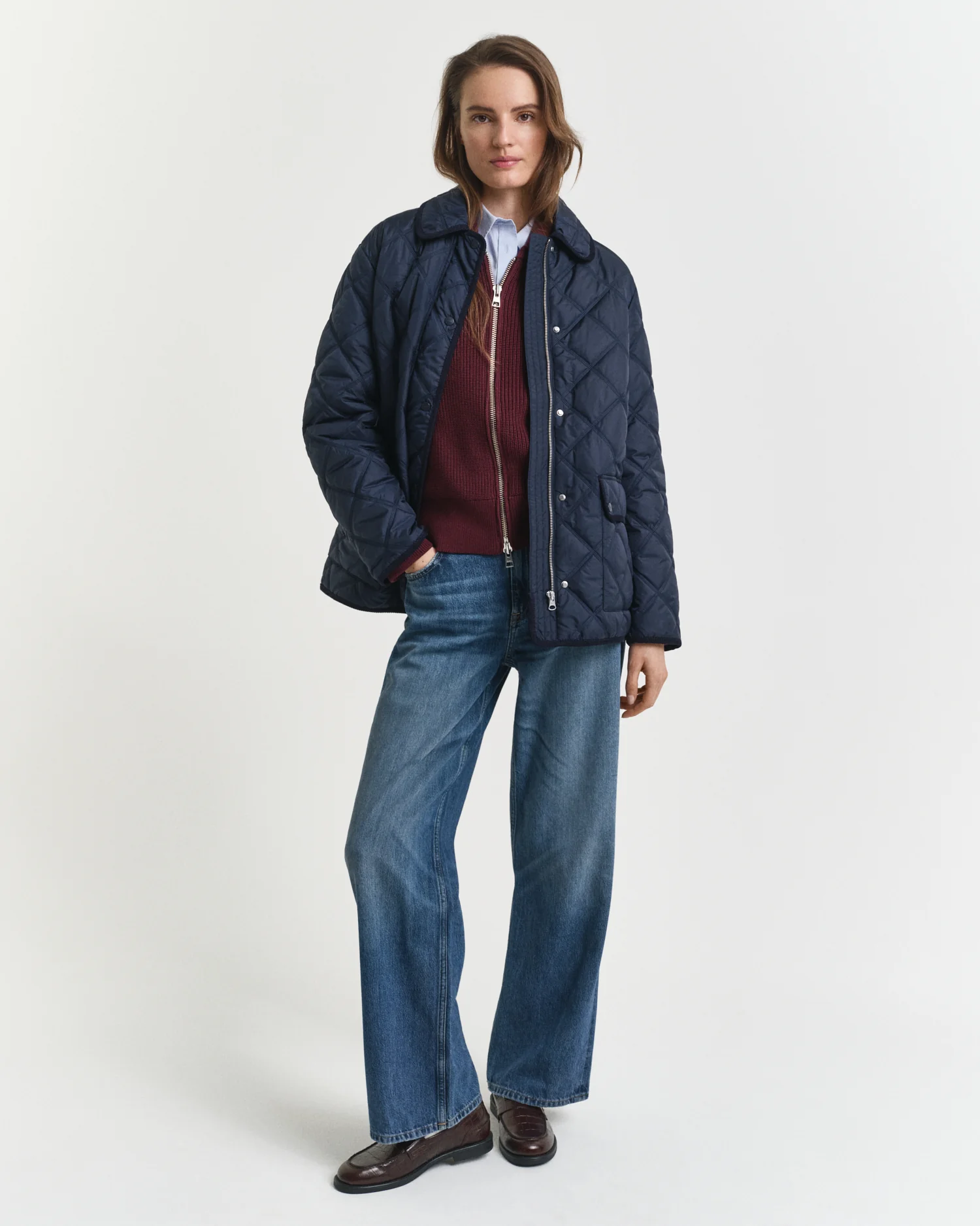 This quilted jacket uses recycled fabrics throughout the whole garment. It's padded and lined with recycled synthetics for a light insulation, and made from a quilted shell with a water-repellent quality. It has a regular fit that sits at hip length and is detailed with a shirt collar, lower patch pockets, and a zipped interior pocket. It has a row of branded snap buttons and a zip at the front with a placket hiding the zip for a cleaner, streamlined look. This jacket is detailed with contrast corduroy trims at the collar, pockets and cuffs, plus a branded jacquard logo lining.