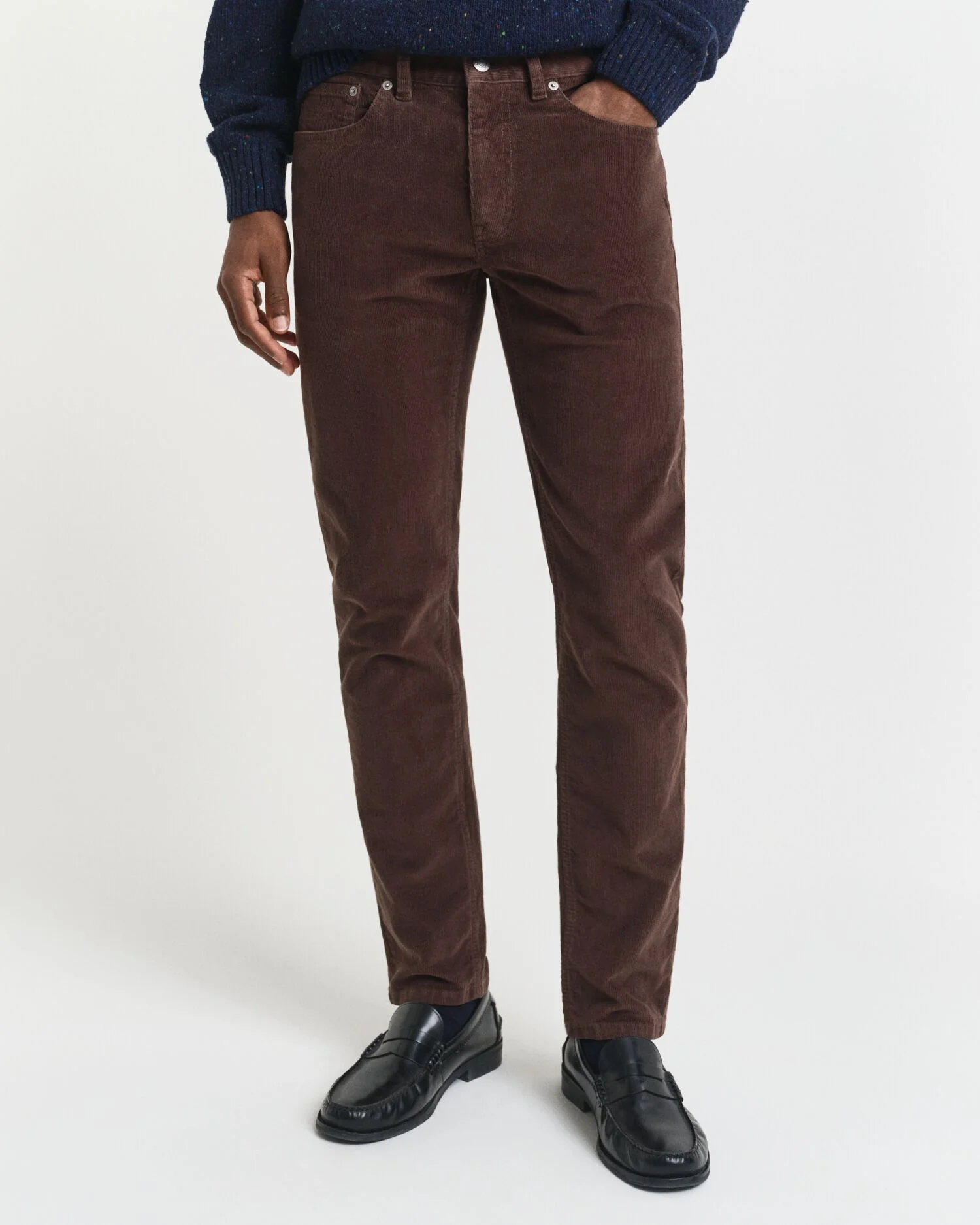 This clean-lined design elevates an everyday wardrobe essential. Crafted from tactile corduroy with comfort stretch, these jeans come in autumnal-winter shades, making them extremely versatile. They're designed for a slim fit with a mid-rise waist and tapered leg. They feature a classic 5-pocket design, branded buttons and rivets, a zip fly and a branded leather label at the back waistband.